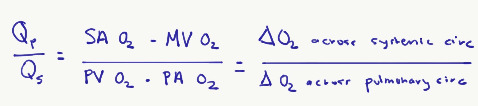 . The magnitude of an inra- or extracardiac shunt can be estimated by flow ratio between the pulmonary and systemic circulation QpQs using hemodynamic data. Bottom of page. Formula B is Flamm equation for mixed venous saturation.